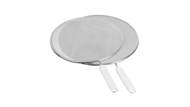 De schermen zijn gemaakt van stevig RVS en voorzien van een fijne gaasstructuur die vet- en vochtspetters effectief tegenhoudt, terwijl stoom eenvoudig kan ontsnappen. De witte handgrepen zorgen voor een frisse uitstraling en liggen prettig in de hand tijdens gebruik.